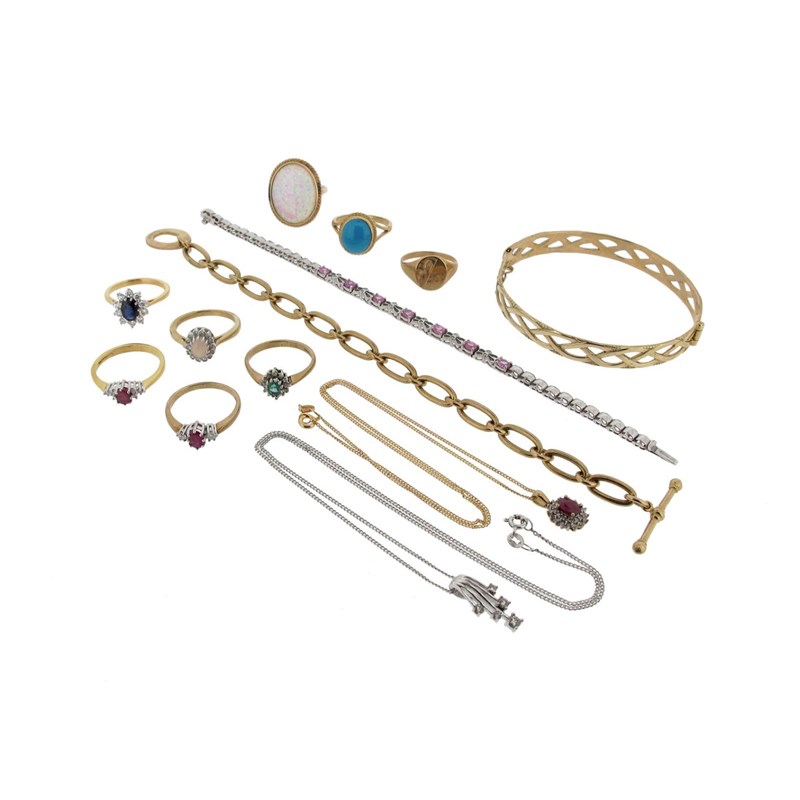 Assorted jewellery, including a diamond and sapphire set 18ct gold cluster ring and seven further plain and stone-set gold rings. A ruby and diamond cluster pendant set in 9ct yellow gold and a diamond-set 9ct white gold pendant, both with fine-link gold chains. A 9ct white gold bracelet set with diamonds and pink stones and a 9ct yellow gold chain link bracelet. A 9ct yellow gold bangle.