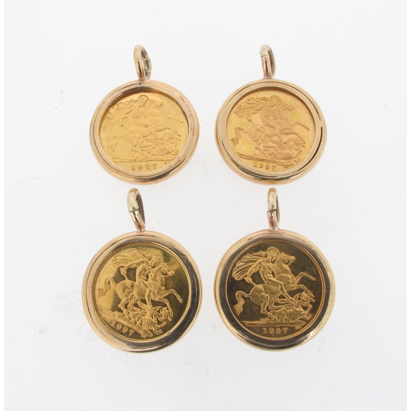 Four half sovereign pendants, all with gold frames. 1987 and 1997 (3). 30g in total.