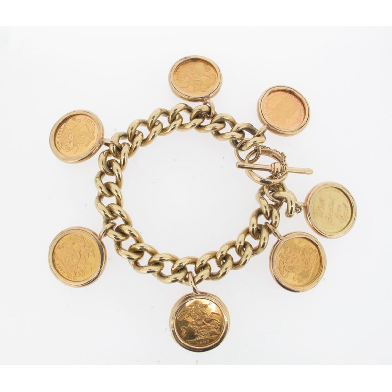 A gold curb link bracelet. With six gold mounted half sovereign pendants and another similar gold medallion pendant.