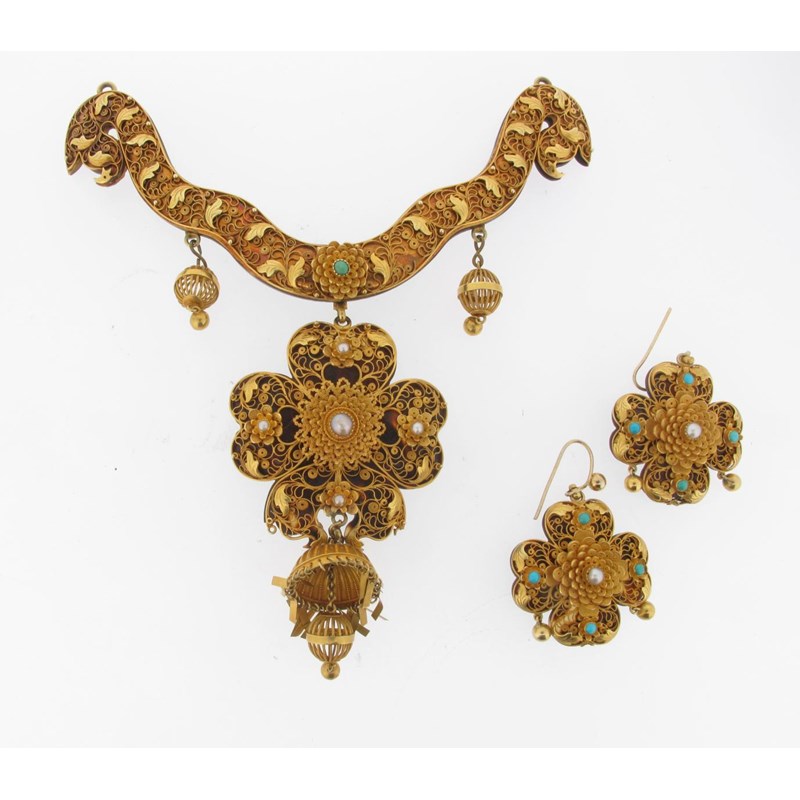 An interesting South East Asian gold and tortoiseshell brooch with matching earrings, all with fine gold filigree decoration, and set with seed pearls and turquoise cabochons. 9.5cm wide.