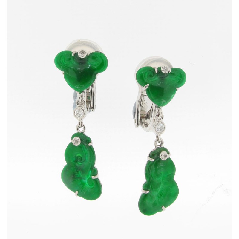 A pair of jade and diamond drop earrings, the carved jadeite sections are set with small circular cut diamonds in white gold.