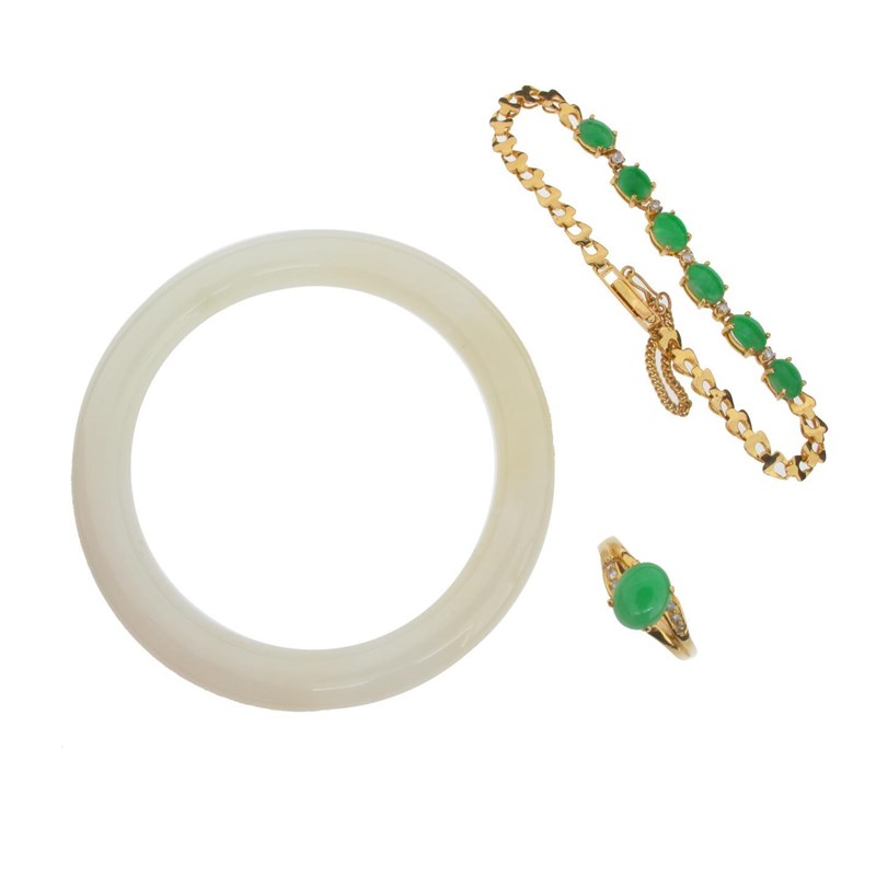 A mutton fat jade bangle, a gold ring mounted with an oval shaped jade cabochon and small diamonds and a gold bracelet alternately set with jade cabochons and small diamonds.