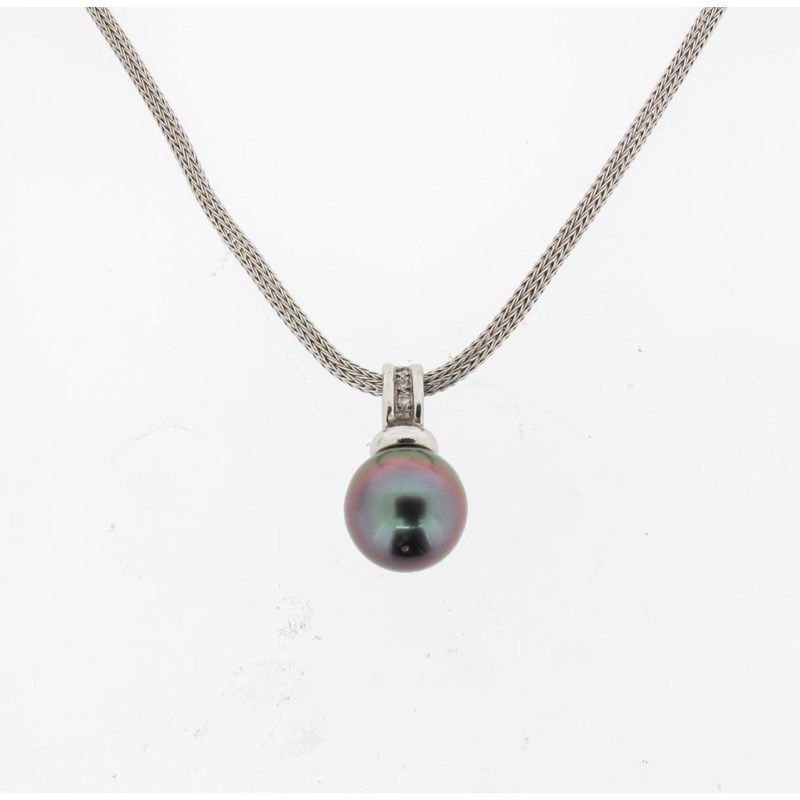 A cultured pearl mounted white gold pendant, on a fine link white gold neck chain.
