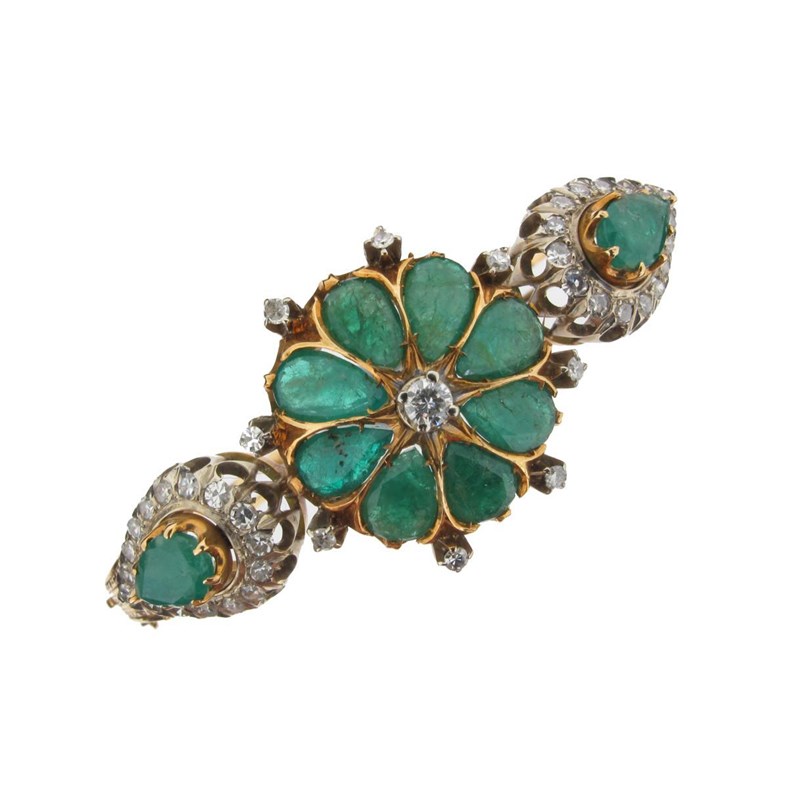 An emerald and diamond gold hinged bangle, mounted with three clusters of pear shaped emeralds and diamonds in gold.