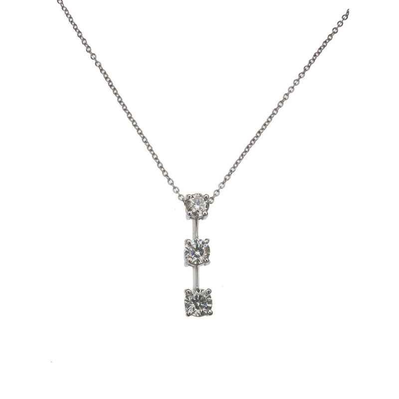 A diamond three stone pendant, the three circular brilliant cut diamonds are set in white gold on a fine link white gold neck chain.