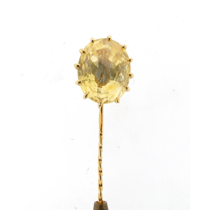 A yellow sapphire mounted gold stick pin.