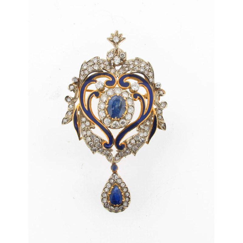 A sapphire and diamond scroll brooch pendant, with blue enamel decoration in silver and gold.