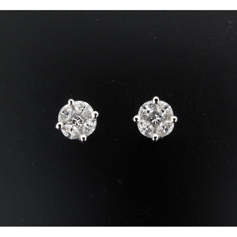 A pair of diamond stud earrings, each stud set with four marquise shaped diamonds and a centre square shaped diamond to the illusion white gold mount.