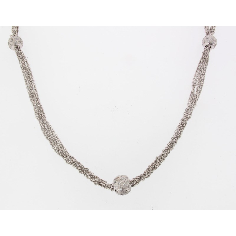 A five row 18ct white gold fine link necklace, with three spherical white gold beads pave set with small diamonds. 43cm. 20g.