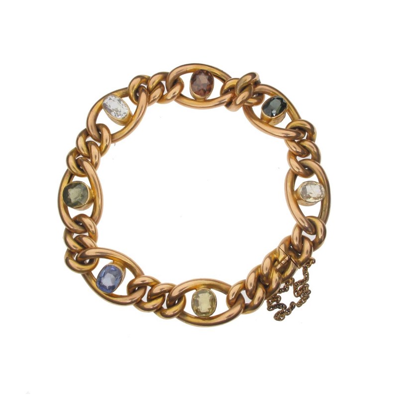 A gold curb link bracelet, mounted with various coloured gem stones. 19cm. 24g.