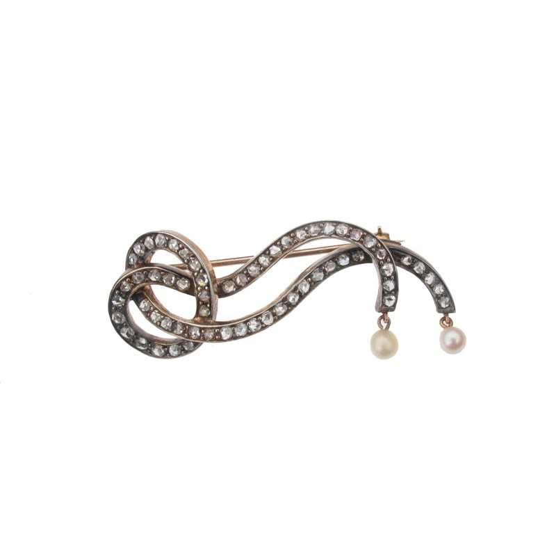 A diamond and pearl set scroll brooch, set with rose cut diamonds in silver and gold and suspending two terminal pearls. Fitted case by Spink.