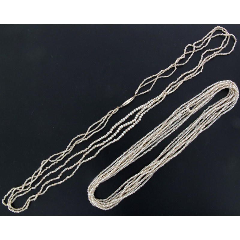 A three row seed pearl necklace (broken) and a seed pearl sautoir. 236cm.