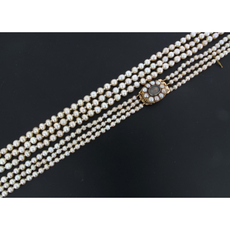 A three row pearl and cultured pearl necklace, the gold clasp mounted with pearls.