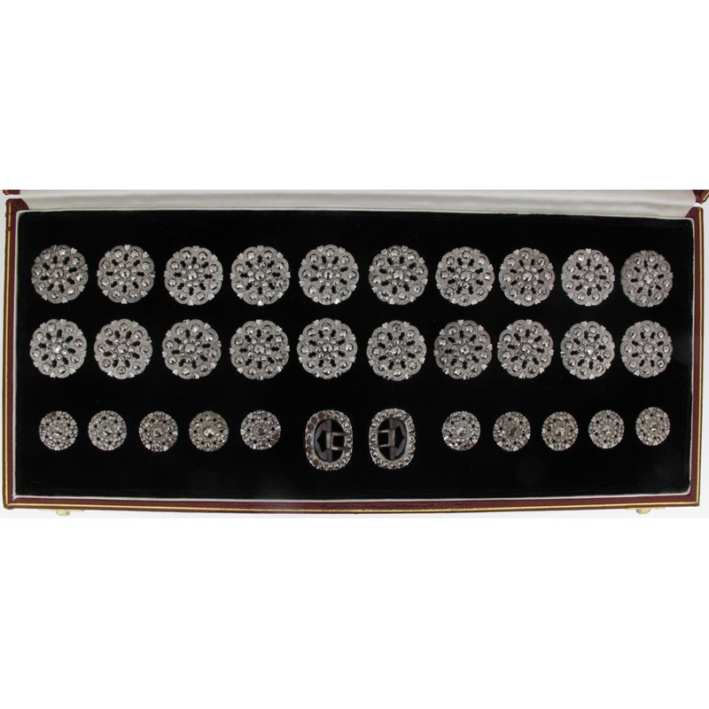 A set of late George III cut steel buttons and buckles, comprising twenty pierced circular buttons, (2.5cm diameter), ten smaller similar buttons (1.6cm diameter) and a pair of buckles. Fitted case.