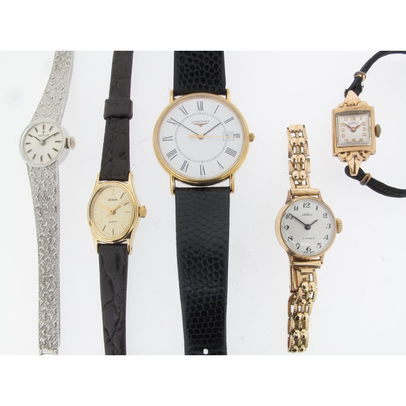 A ladies 9ct integrated white gold wristwatch by Tiso, and four other wristwatches.