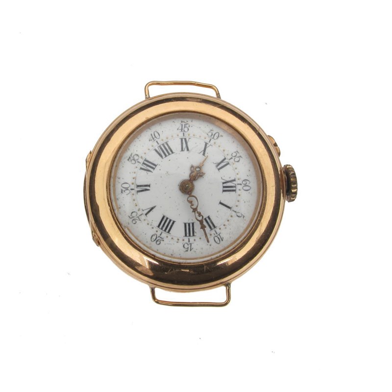 A ladies 18ct gold wristwatch, with black Roman hour numerals, the winder at XII.