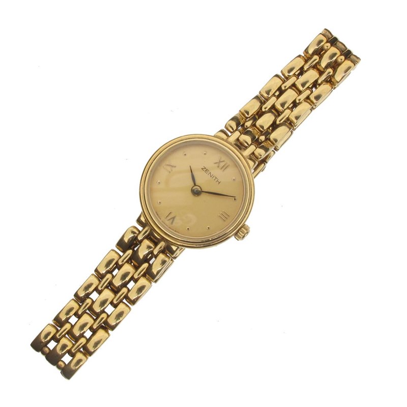 A ladies 9ct gold wristwatch by Zenith, signed plain dial with Roman numerals at the quarters. 9ct yellow gold bracelet. 20g in total.