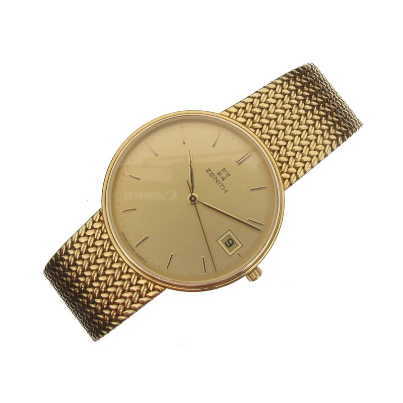 A gentlemans 9ct gold wristwatch by Zenith, plain signed dial with sweep seconds hand and date aperture. With 9ct integrated yellow gold band. 56g in total. Zenith case and papers.