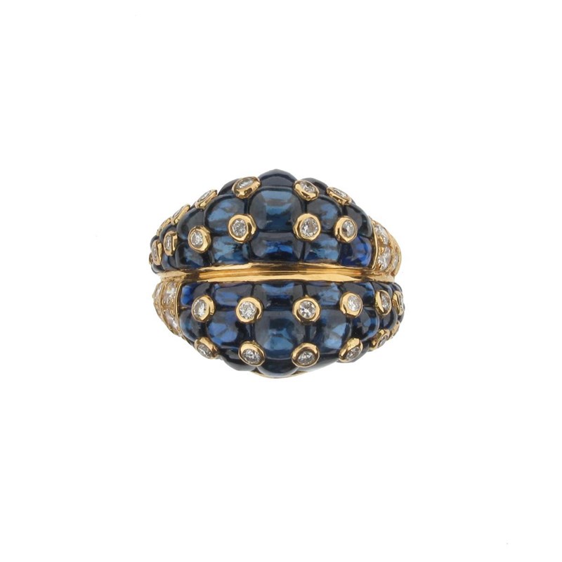 A French sapphire and diamond two row ring, pave set with cabochon sapphires set with pairs of small diamonds and further diamonds to the shoulders. French control marks to the shank exterior. Size I.