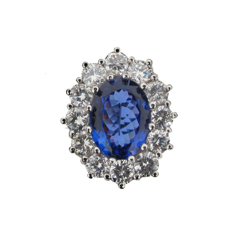 A tanzanite and diamond ring. The oval tanzanite is set within a surround of twelve circular cut diamonds in white gold. Size O 1/2.