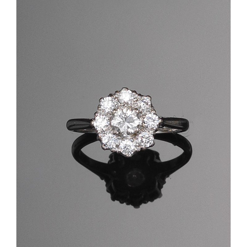 A diamond cluster ring. The centre round brilliant cut diamonds set within a surround of eight...
