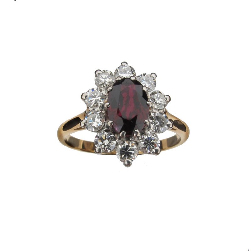 A ruby and diamond cluster ring, the oval shaped ruby is set within a surround of ten round brilliant cut diamonds in gold. Size O 1/2.
