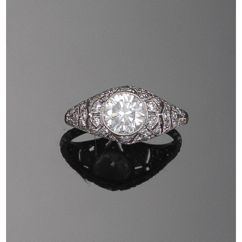 A diamond cluster ring, the centre circular cut diamond is set in platinum and millegrain set with smaller diamonds to the shoulders. Size M 1/2.