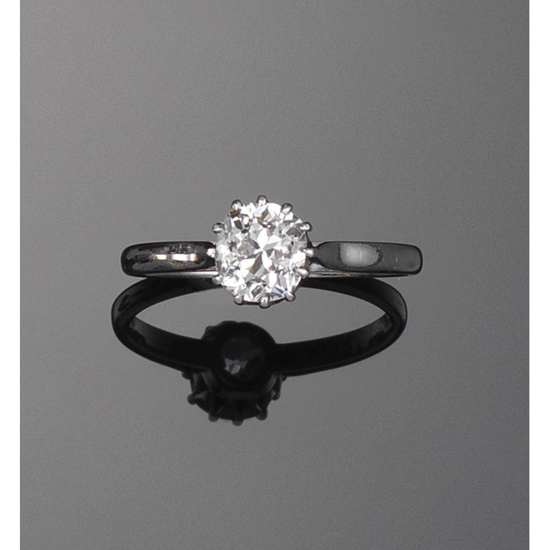 A diamond solitaire ring, the slightly oval shaped diamond is set in white gold. Size P.