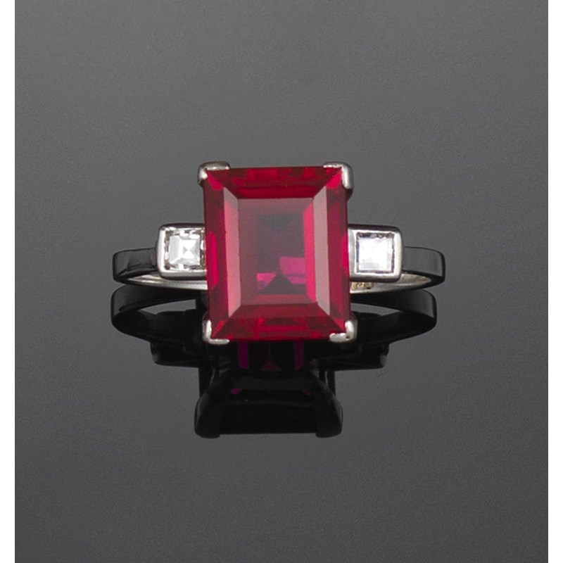 A synthetic ruby and diamond ring. The rectangular cut synthetic ruby set with a square cut...