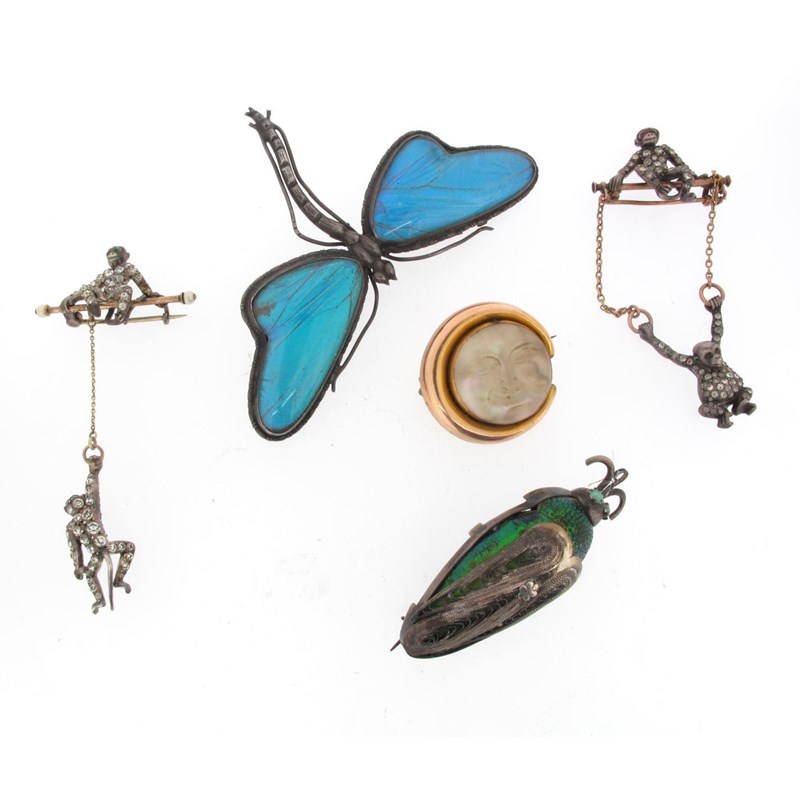 A monkey brooch, the monkey seated on a gold bar with pearl terminals and pave set with circular cut white pastes and green paste eyes. With another similar monkey hanging from a chain. Another similar brooch suspending a paste set silver orangutan, a silver dragonfly brooch mounted with butterfly wing, an iridescent green beetle with silver mounts and a gold mounted man in the moon brooch.