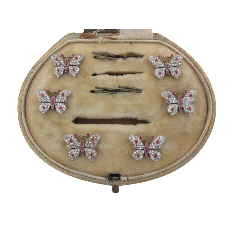 A set of six dress links. In the form of small butterflies pave set with diamonds and rubies. With further rubies to the body. Set in gold. Cased. The butterflies 1.5cm wide.