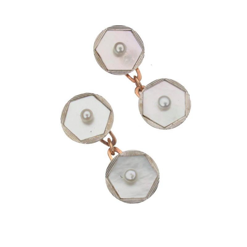 A pair of circular gold cufflinks. Set with hexagonal sections of mother of pearl within a white gold engine turned surround and surmounted with a small pearl.