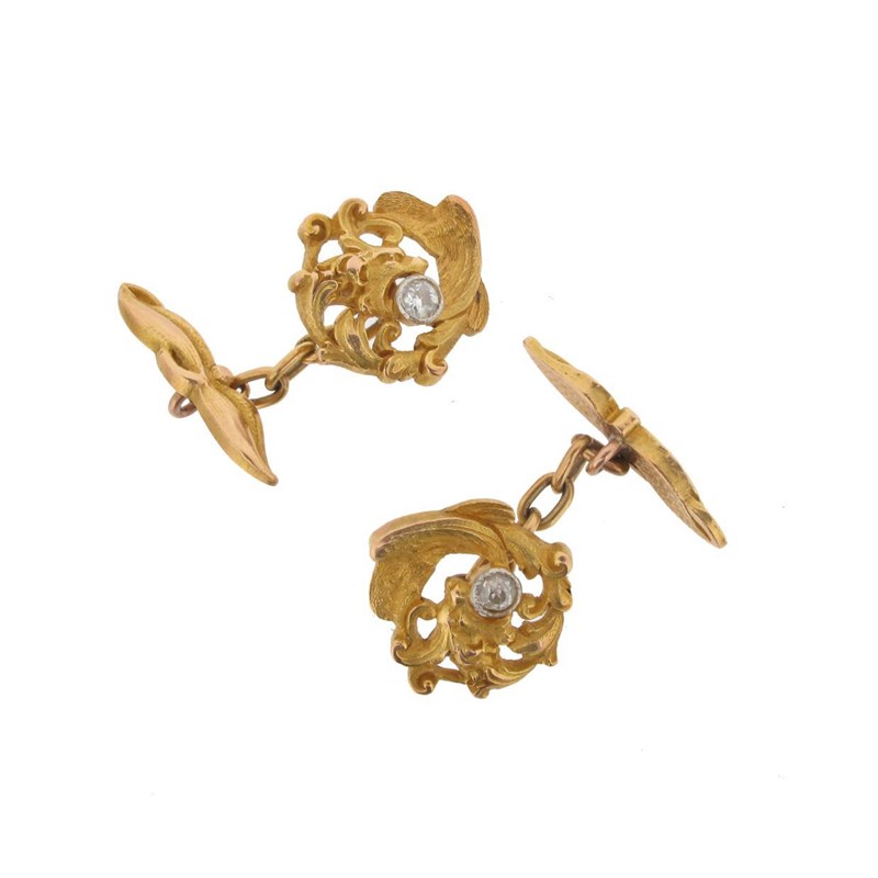 A pair of gold pierced stylised scrolling dragon cuff links. Possibly American. Each mounted with a circular cut diamond.