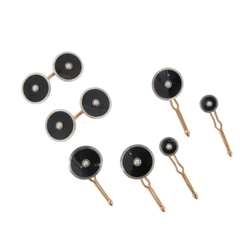 A set of dress cuff links and studs. Comprising pearl set circular black onyx cuff links in...