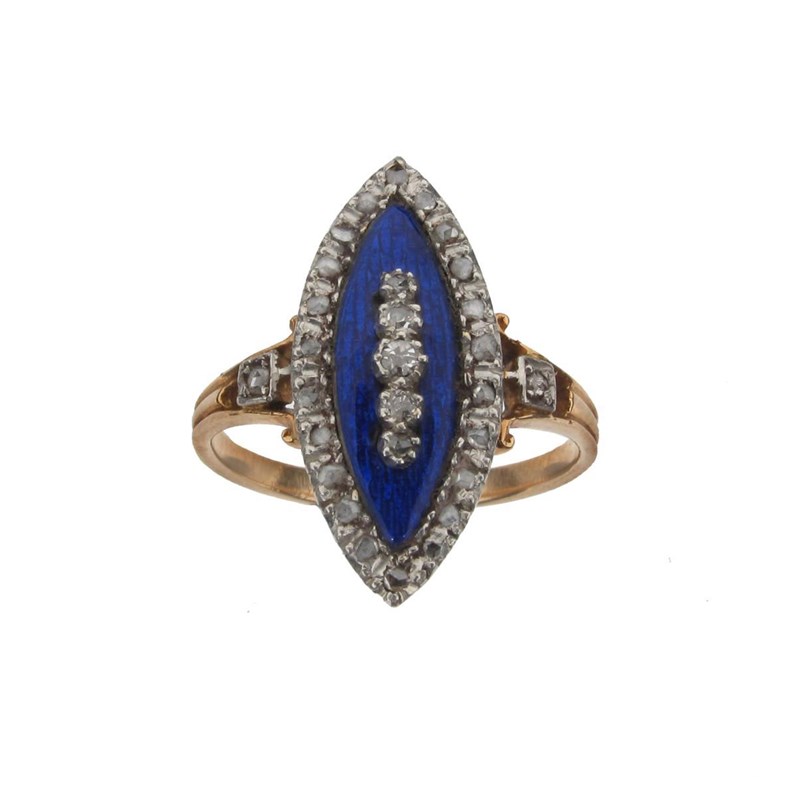 A Victorian diamond set marquise shaped ring. Set with a centre line of five graduated small diamonds to the blue guilloche enamel ground and with surround of further small diamonds in gold. The reverse of the ring with fluted decoration.