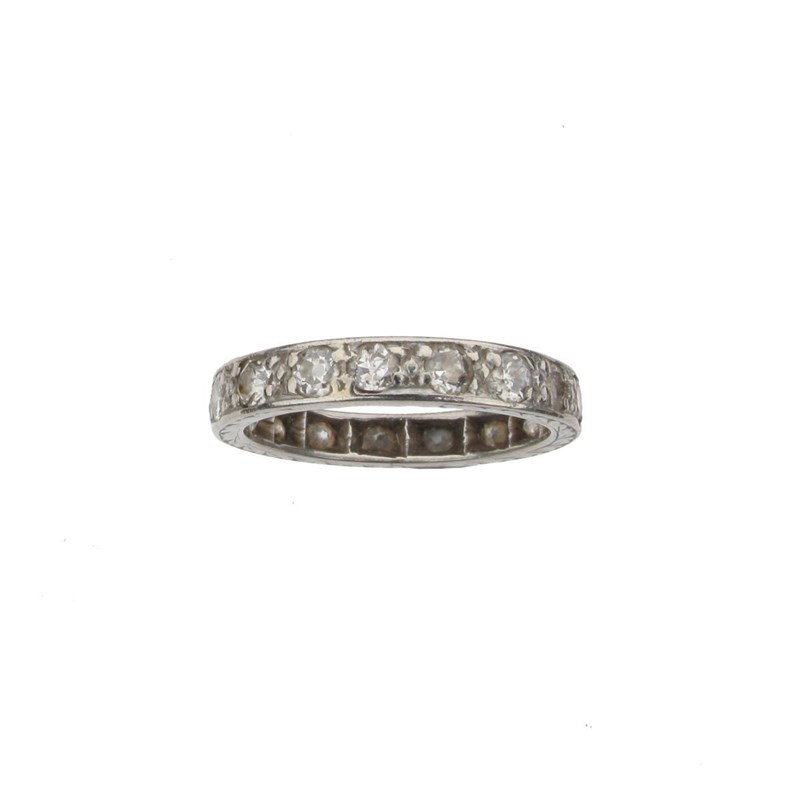 A diamond full circle eternity ring, the circular cut diamonds are set in platinum. Size M.
