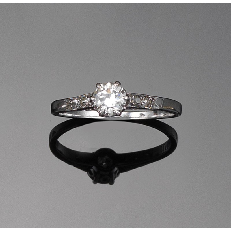 A diamond solitaire ring, the transitional circular cut diamond is set with four small shoulder diamonds in platinum. Size O 1/2.