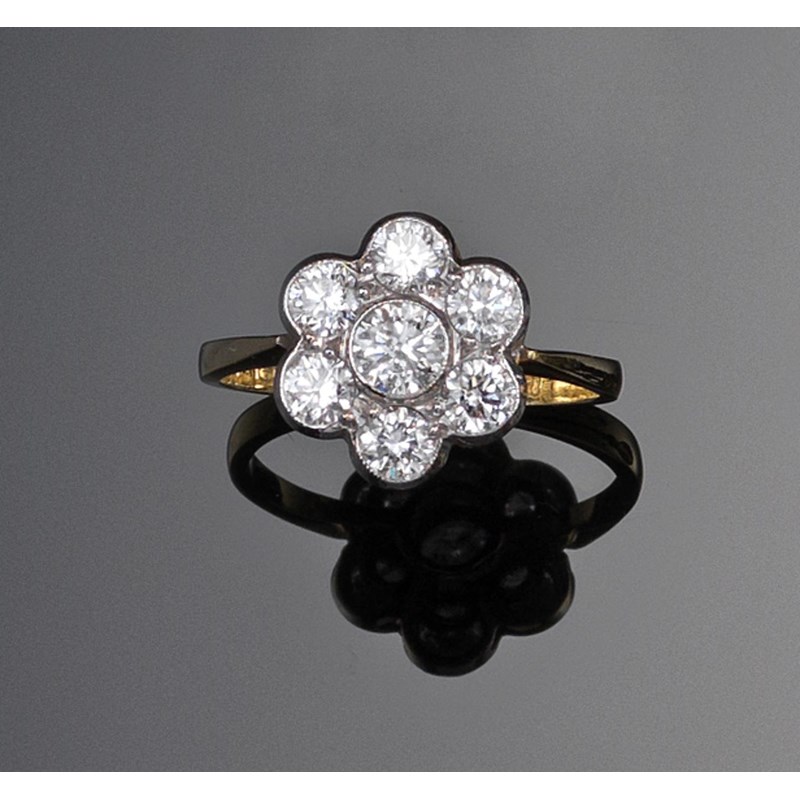 A diamond cluster ring, the seven circular cut diamonds set in yellow and white gold. Size N 1/2.