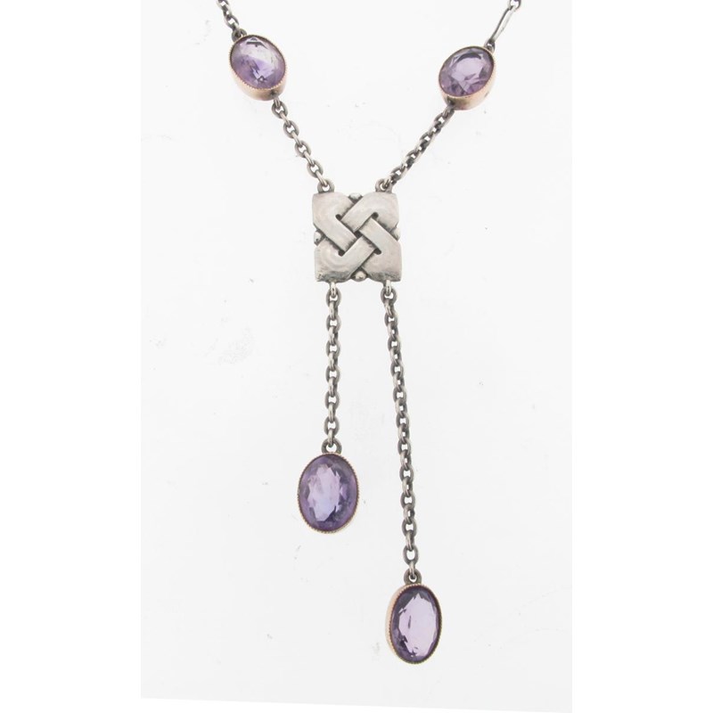 Murrle Bennett & Co, an amethyst set silver necklace, circa 1905, with centre square section Celtic Knot panel and four oval shaped amethysts, stamped MB&Co 950.