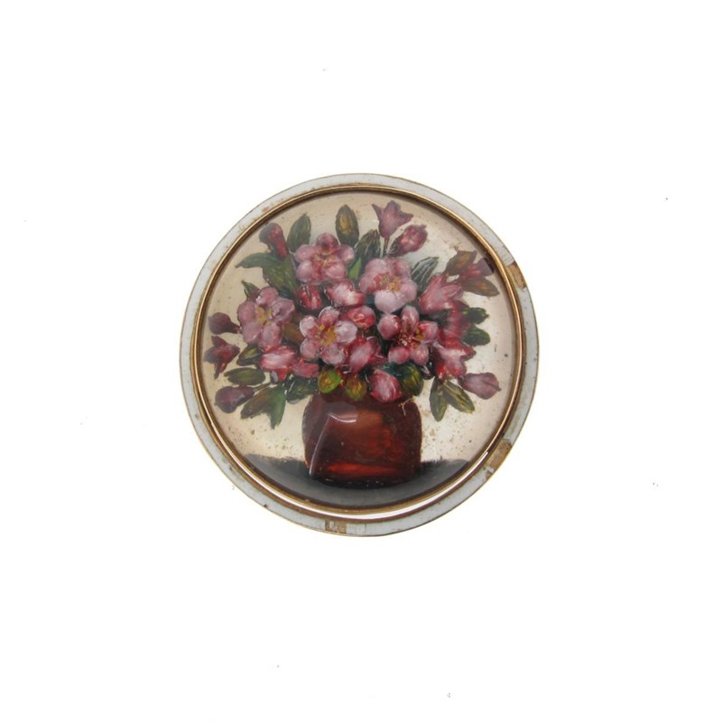 An Austro Hungarian early 20th Century reverse carved crystal brooch, the circular crystal painted with a vase of flowers within white enamel border. The gold frame engraved to the reverse 1916. 2.5cm wide.