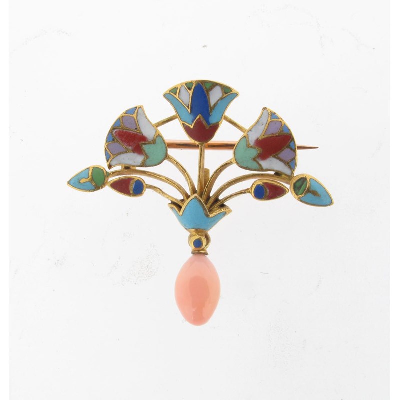 An Egyptian influenced gold brooch, with enamel lotus decoration and suspending a conch pearl. 3cm wide.