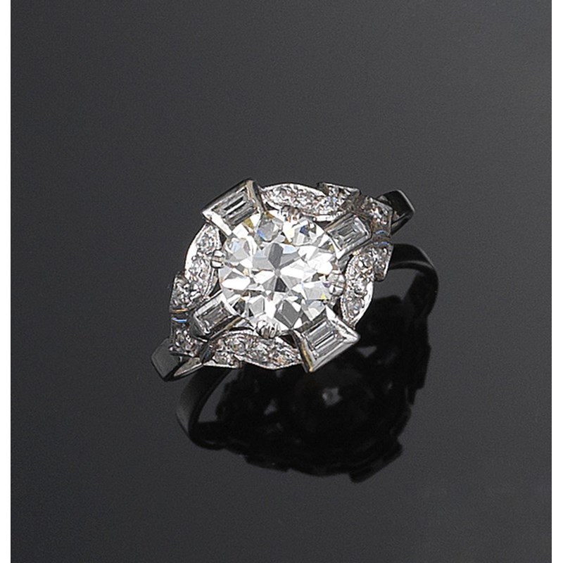 A diamond cluster ring, the transitional circular cut diamond weighs approximately 1.85cts and is set in platinum with smaller circular and baguette shaped diamonds. Size P 1/2.