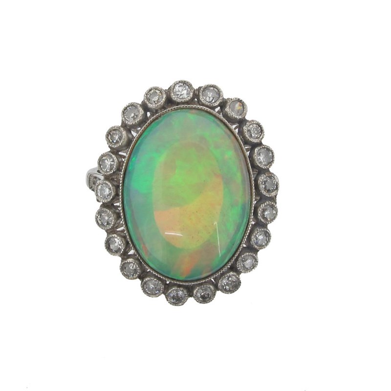 An opal and diamond cluster ring, the solid oval shaped opal is set within a surround of twenty one small old circular cut diamonds in white gold. With six further shoulder diamonds, size O.