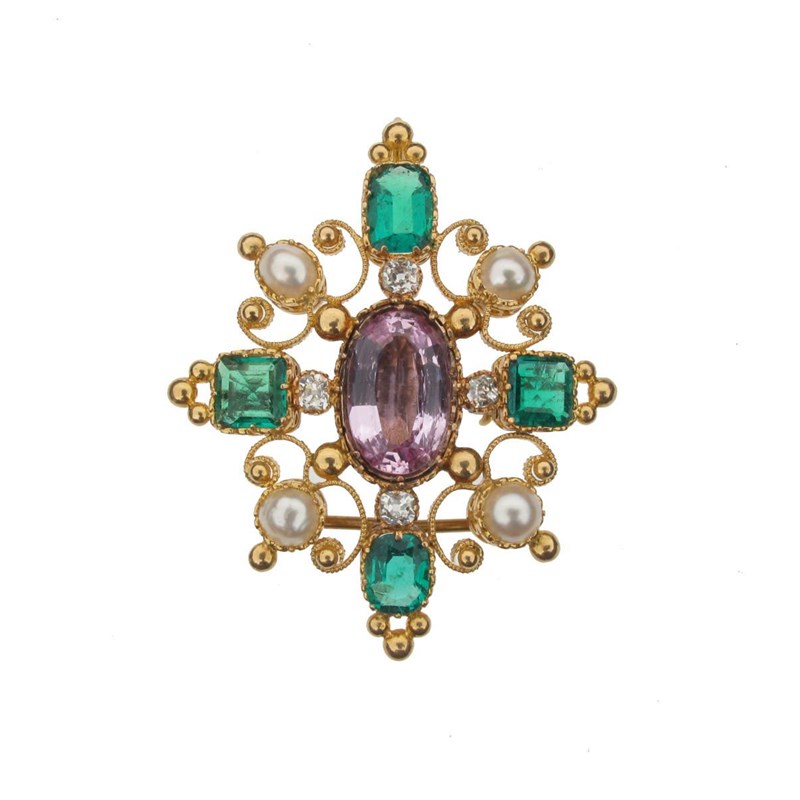 An early 19th Century gold brooch centred with an oval shaped pink topaz, four emeralds, four diamonds and four half pearls in a filigree gold mount.