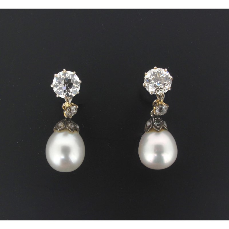 A pair of cultured pearl and diamond drop earrings, the slightly pear-shaped cultured pearls each suspend from a circular-cut diamond and smaller diamond with diamond set caps, each pearl measures 9.5 and 9.6mm diameter.
