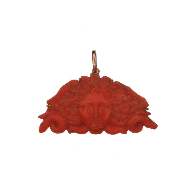 A carved coral pendant, depicting the head of Medusa with gold pendant loop. 4.4cm wide.