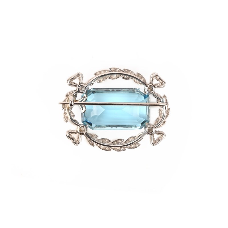 A BELLE ÉPOQUE AQUAMARINE AND DIAMOND BROOCH, centring on a step-cut aquamarine within diamond-set laurel surround quartered with bows in platinum, length 3.6cm