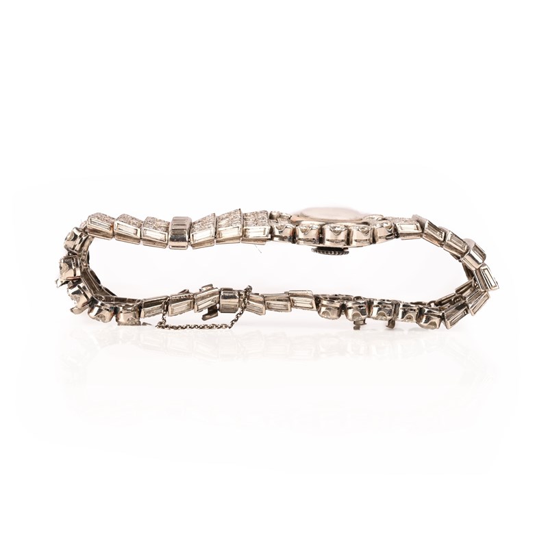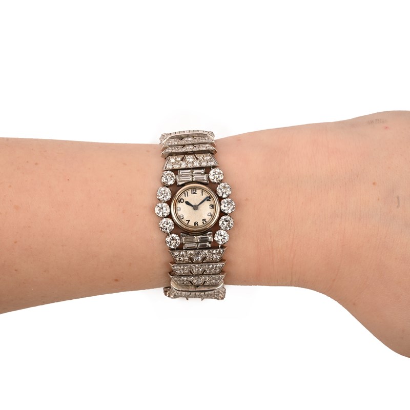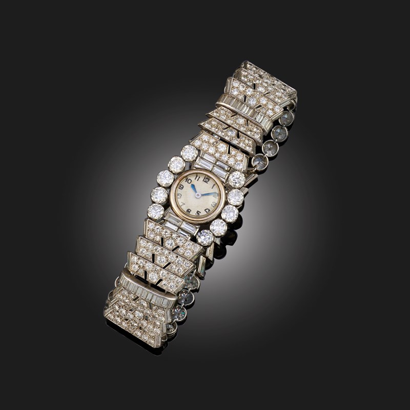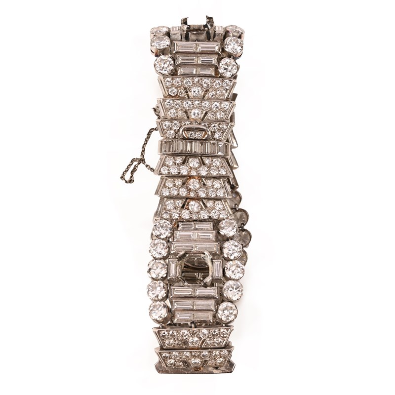 A LADY'S ART DECO DIAMOND-SET WATCH BRACELET, 1930's, the circular white dial with black Arabic numerals and blued steel hands, within a border of round brilliant-cut and graduating baguette-shaped diamonds, to a bracelet of geometric design set with graduating round brilliant-cut and baguette-shaped diamonds, in platinum, inner circumference approximately 17cm, two principal round stones to the bracelet missing