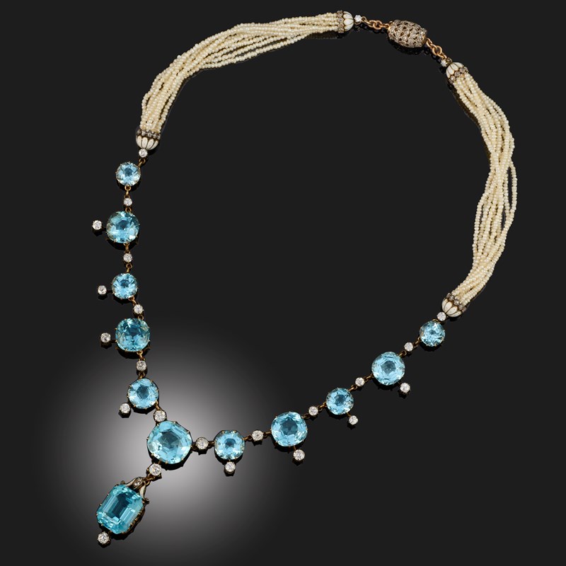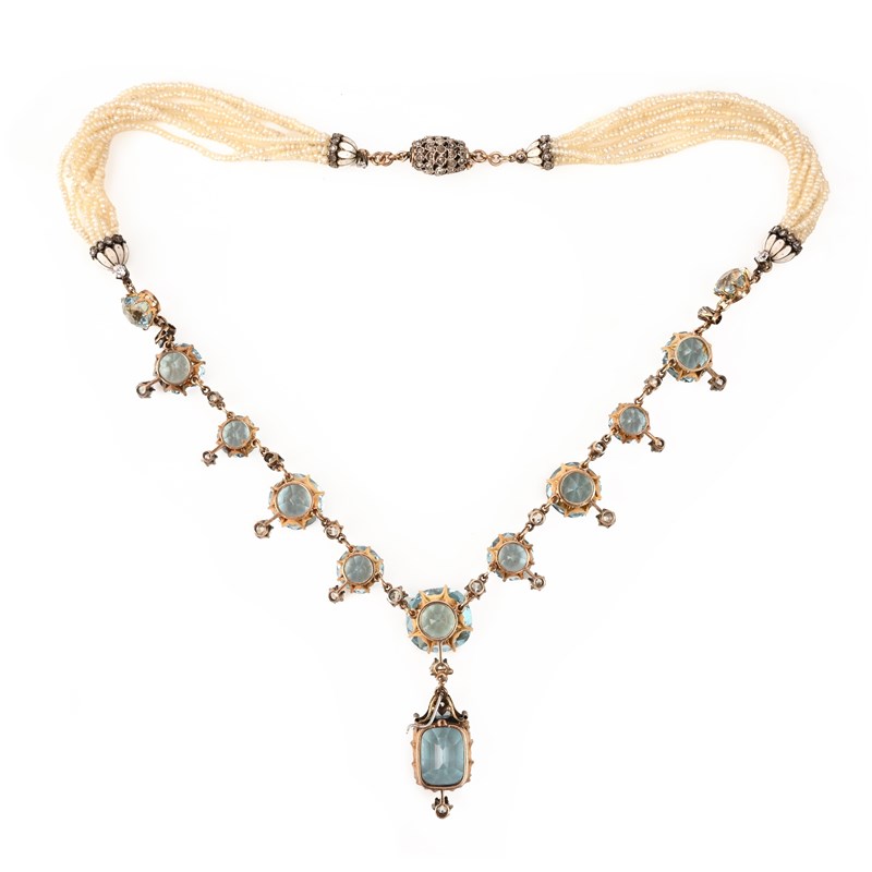 AN AQUAMARINE, DIAMOND, ENAMEL AND SEED PEARL NECKLACE, C1900