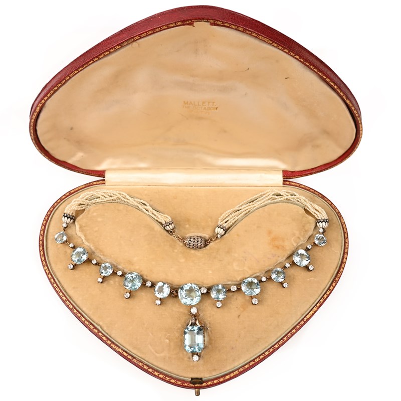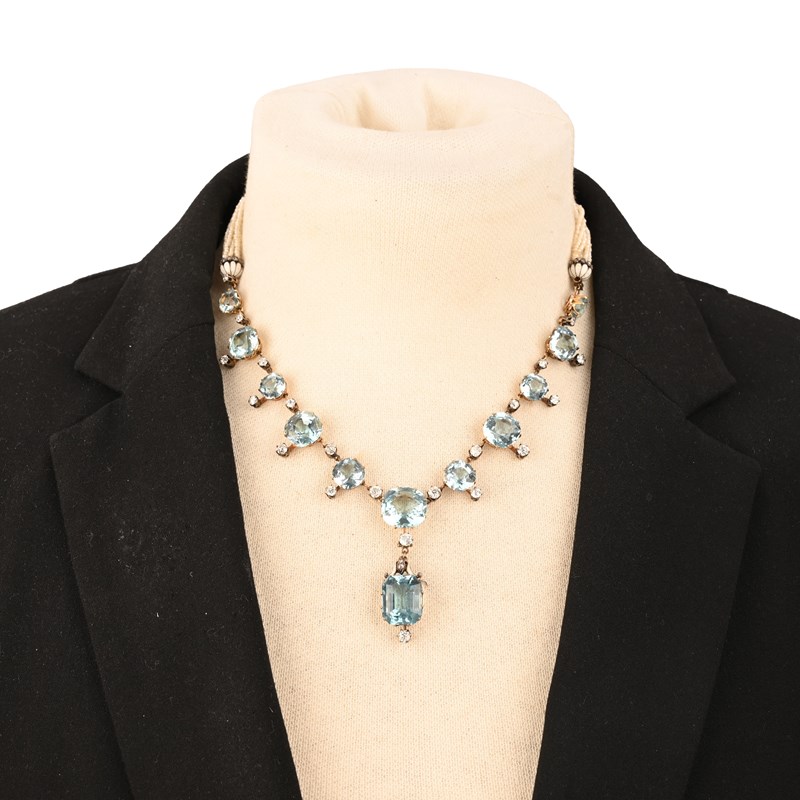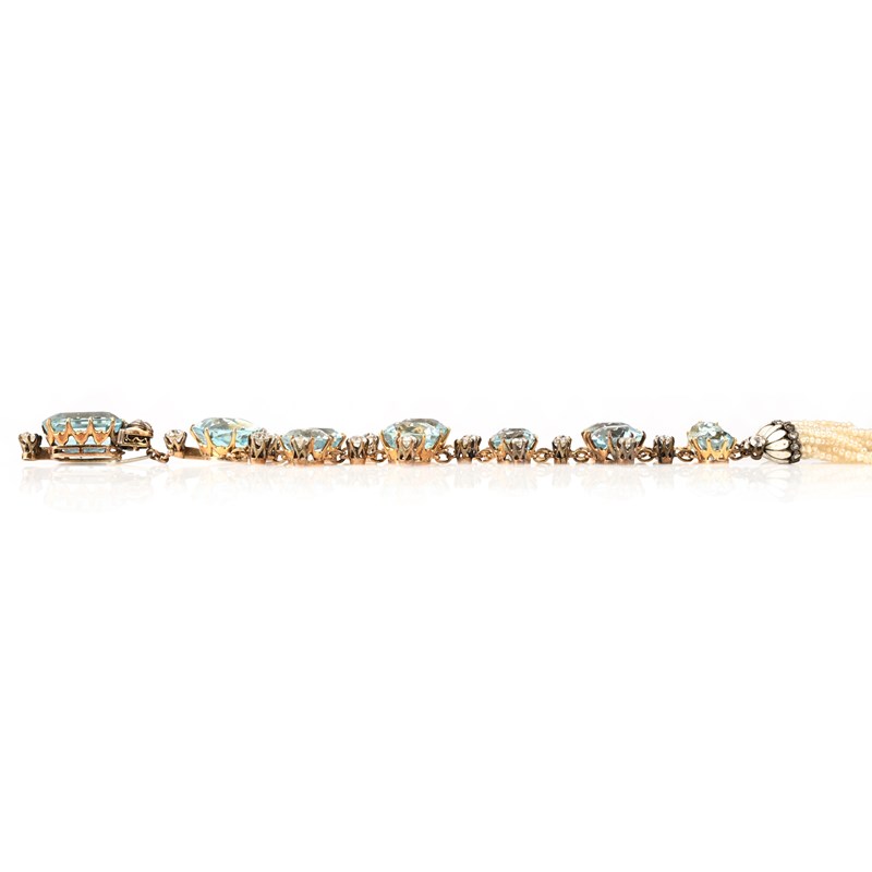 AN AQUAMARINE, DIAMOND, ENAMEL AND SEED PEARL NECKLACE, C1900, with graduating cushion-shaped aquamarines suspending diamonds and separated with diamonds, the central aquamarine suspending a detachable pendant set with an emerald-cut aquamarine and a diamond with enamel decoration, on a seed pearl back chain with enamel and diamond set caps and a clasp set with rose-cut diamonds, length 43cm, cased